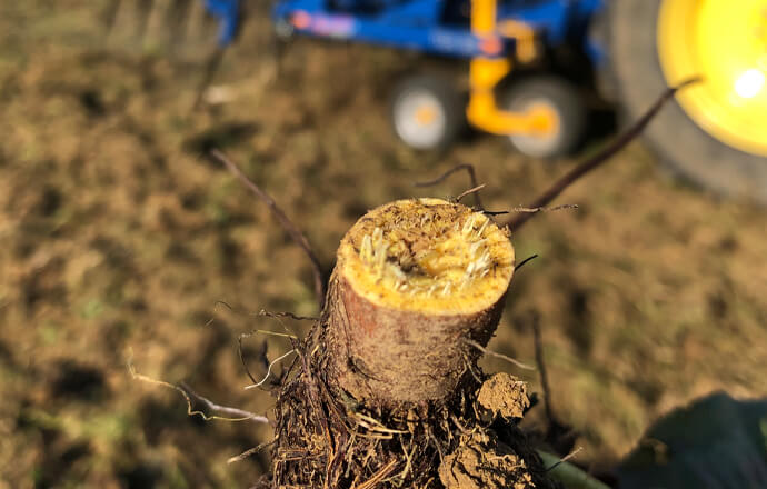 El objetivo es agotar las reservas energéticas en las raíces, para el cultivo del rastrojo o en primavera.  Las malezas de la raíz se deben recortar entre la raíz y la masa de hojas. Crucial: Las malas hierbas de la raíz solo se pueden cortar una vez; de lo contrario, los brotes se multiplicaran y las reservas se llenaran.
